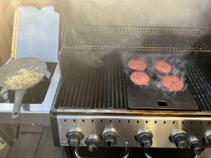 Nachdem die Sauce soweit fertig ist und warmgehalten wird, wird der Grill vorgeheizt. Wir haben uns für den Gasgrill entschieden. Dort können die Zwiebeln direkt auf dem Seitenbrenner geschmort werden und gleichzeitig die Patties auf der Gussplatte gegrillt werden. Nach zwei bis drei Minuten wird gewendet, eine Scheibe Cheddar aufs Patty gelegt und die zweite Seite ebenfalls zwei bis drei Minuten gegrillt. Lege die Patties zum durchziehen aufs Warmhalterost. Der Bacon muss jetzt noch schön kross gebraten werden. Den kannst du am besten im restlichen Fett auf der Plancha braten.