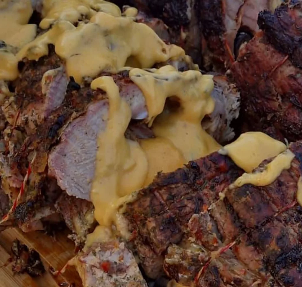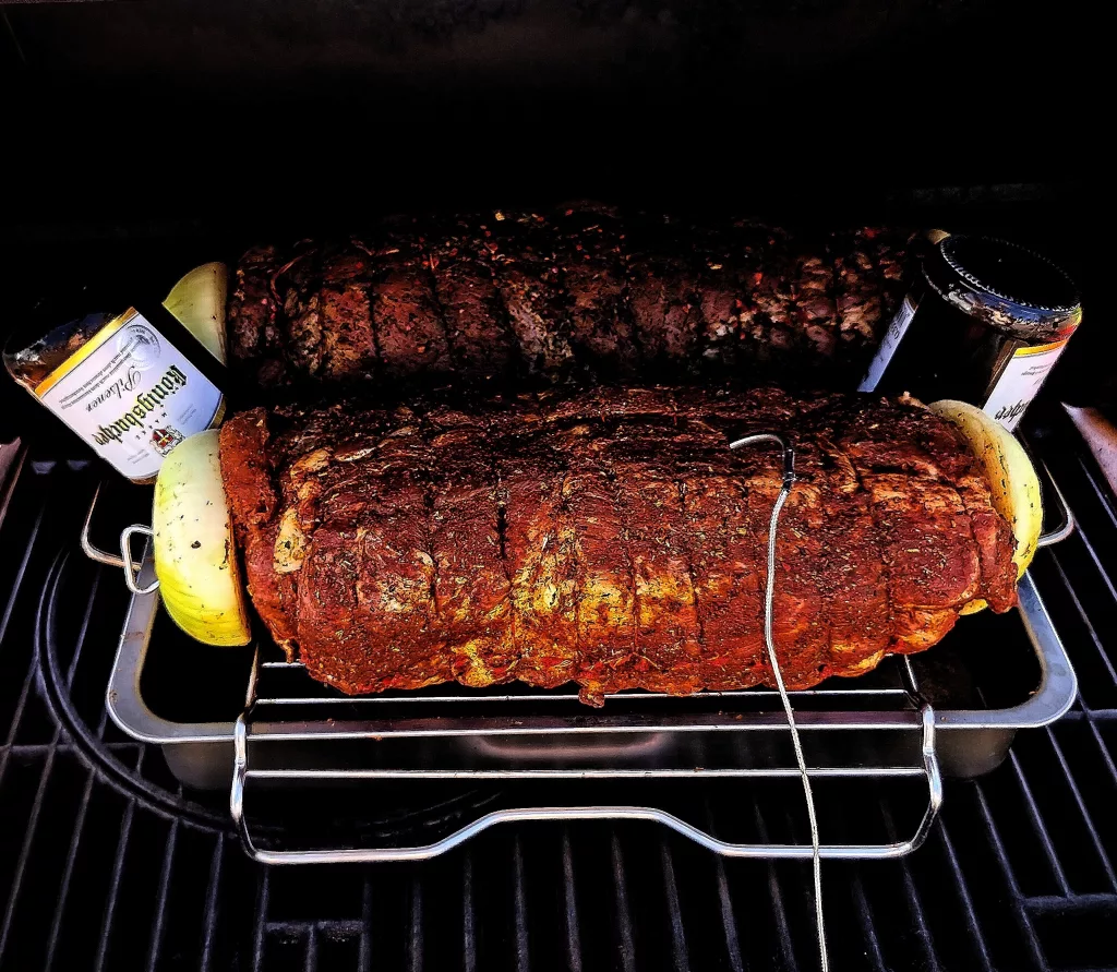Bei 160-180 Grad bleibt der Spießbraten ca. 2 Stunden auf dem Grill. Jetzt sollte der Chili Cheese Braten eine Kerntemperatur von 72° – 75° Grad haben.