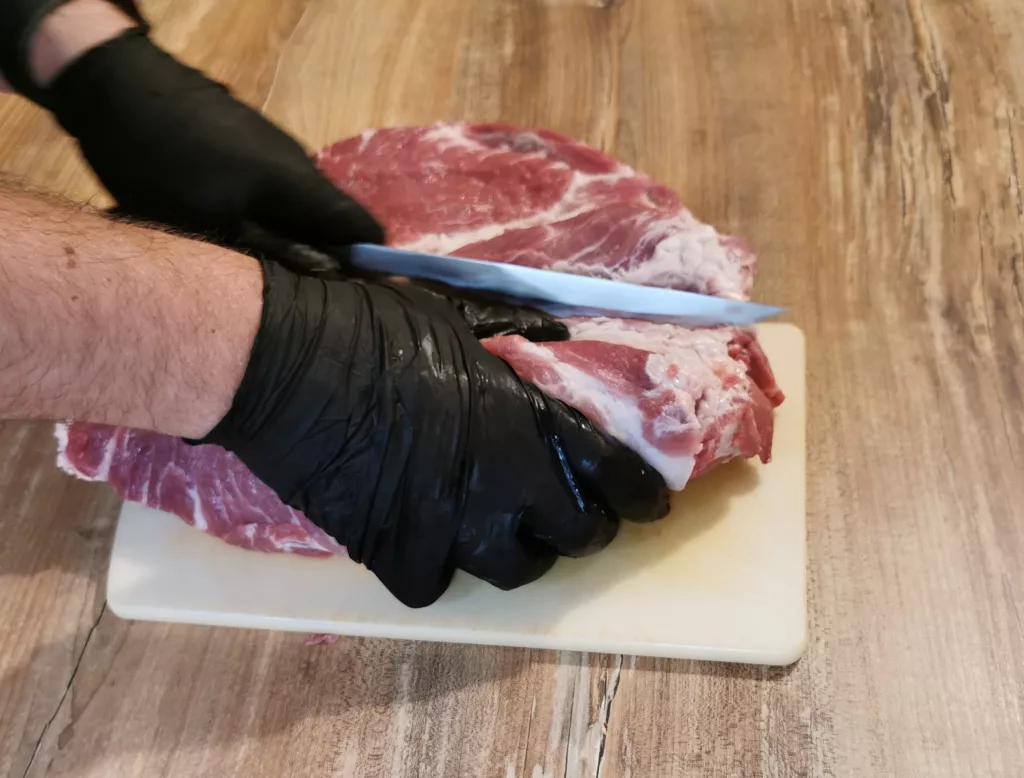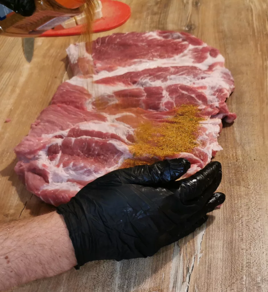 Am nächsten Morgen nimmst du dir den Schweinenacken vor. Schneide ihn vorsichtig, wie ein Schneckenhaus auf. Du beginnst an einer Stelle zu schneiden und rollst ihn dabei immer weiter auf. Ist er komplett aufgeschnittenen kannst du ihn jetzt von beiden Seiten rubben.