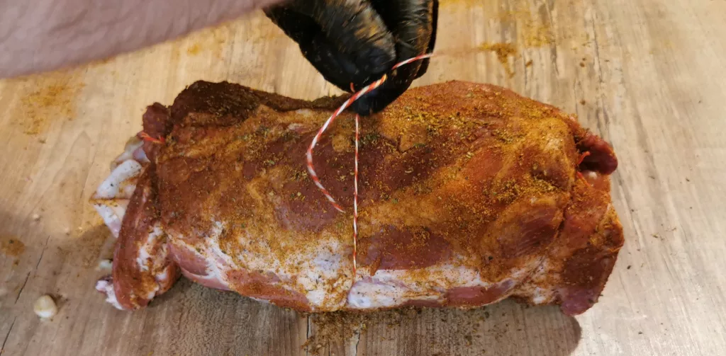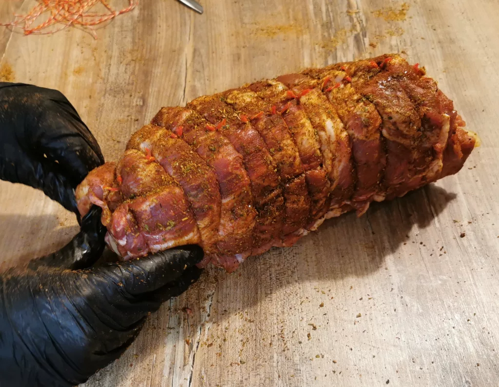 Nimm dir das Küchengarn, schneide ein gute Stück ab und beginne den Braten an den Enden zu zubinden. Anschließend noch ein Knoten in der Mitte und dann kannst du den Braten etwa alle 2 cm fest zubinden. Hier ist übrigens eine helfende Hand seeehr wertvoll!