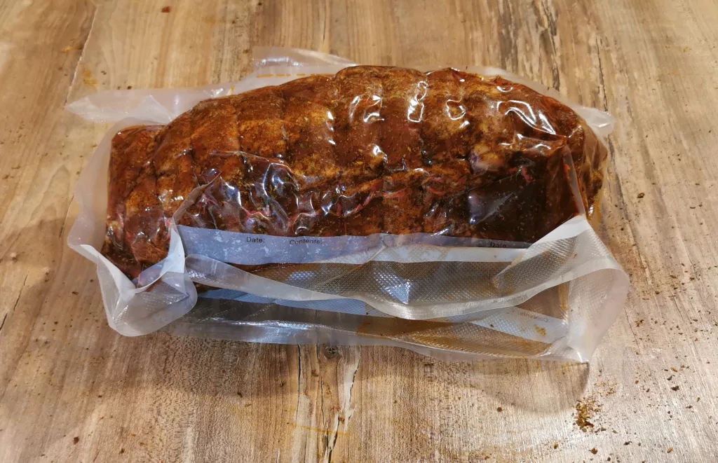 Falls du noch genügend Zeit hast ,solltest du den Spießbraten jetzt einvakuumieren und einige Stunden oder auch über Nacht im Kühlschrank ziehen lassen.