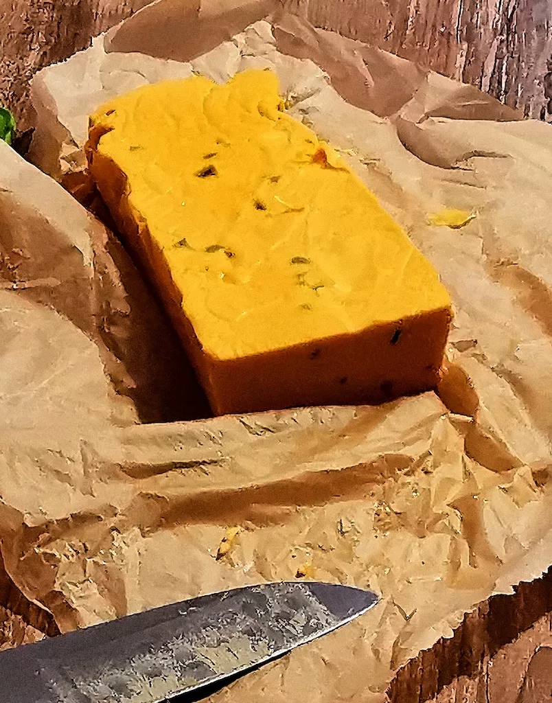 Anschließend nimmst du den festgeworden Chili Cheese Block aus dem Kühlschrank. Schneide ihn in Streifen und fülle den Spießbraten. Falls du nicht den ganzen Käse in den Spießbraten bekommst, solltest du ihn aufbewahren und später als Sauce über den Spießbraten geben.