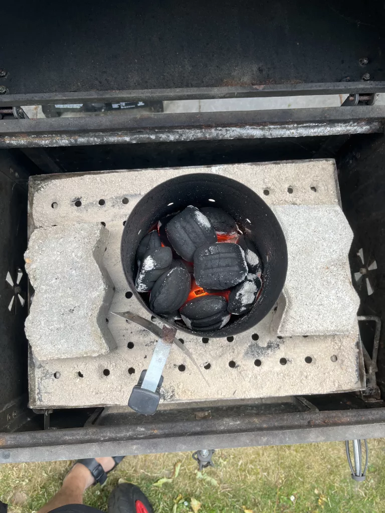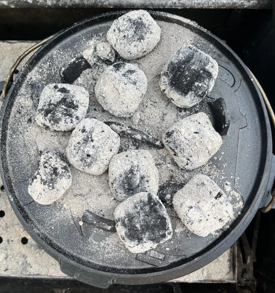 Jetzt wird der Dutch Oven mit einem Schluck Öl auf etwa der Hälfte der Briketts erhitzt. Im Anschluss kommt kommt die Maße in den Topf, der Deckel wird geschlossen und die andere Hälfte der Briketts werden auf dem Deckel positioniert.