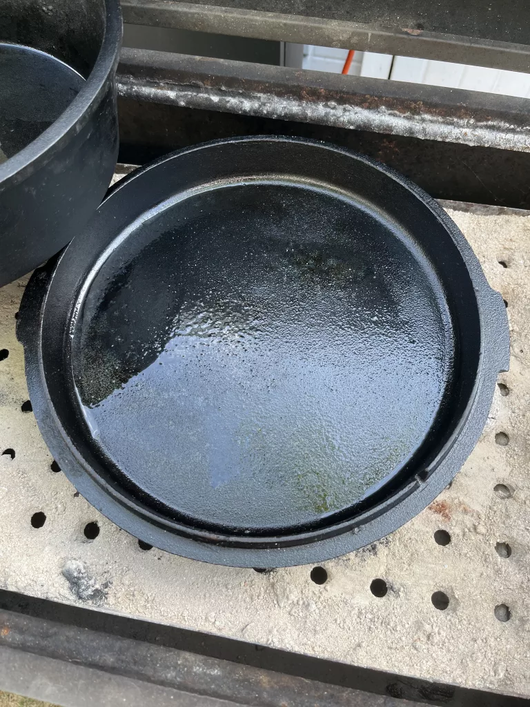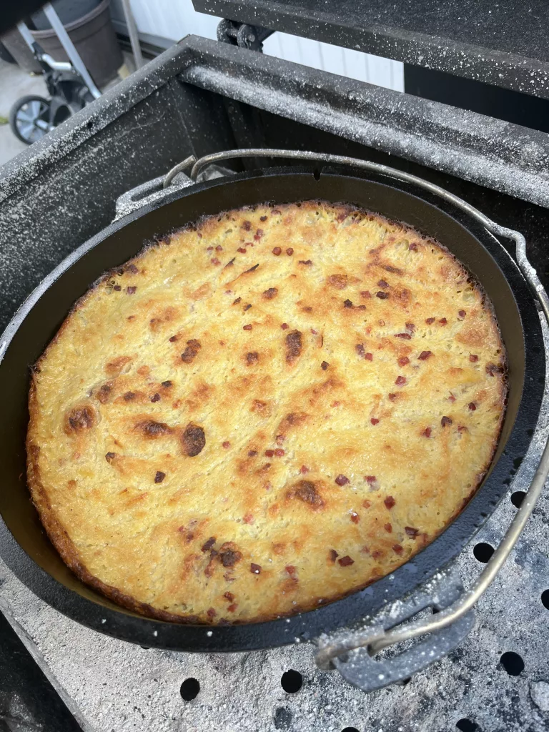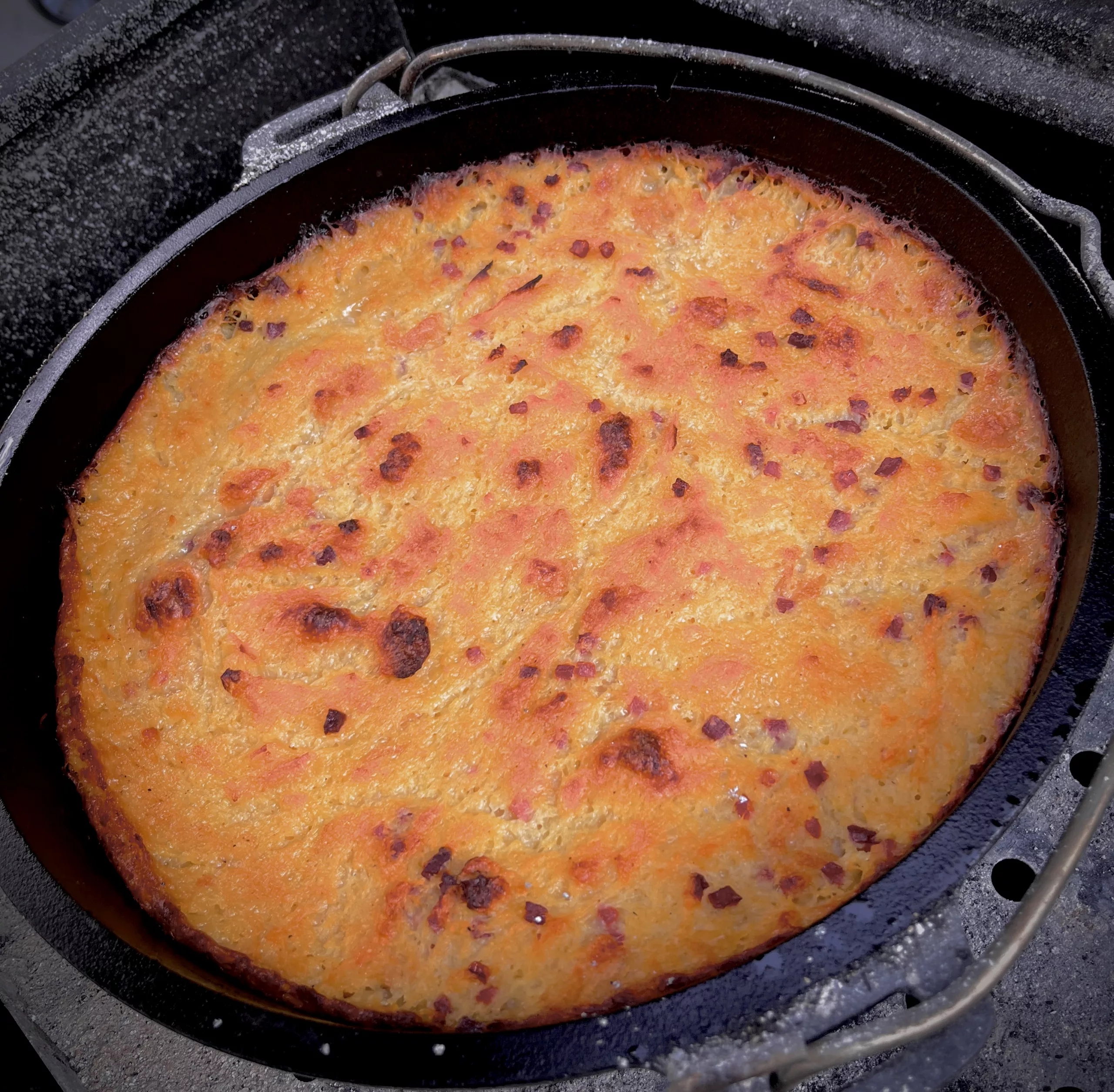 Nach etwa 2-2,5 Stunden sollte der Döppekuchen fertig sein. Kleiner Tipp: Prüfe ab und an die Temperatur. Je nach Briketts kann es passieren, dass diese nicht die ganzen 2-3 Stunden die Temperatur halten und du ggf. ein paar Briketts nachlegen musst. Bei höherwertigen Kohlen sollte das jedoch kein Problem sein.