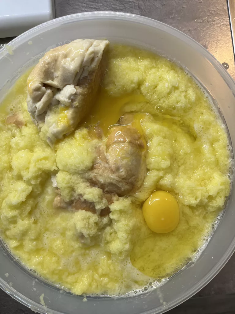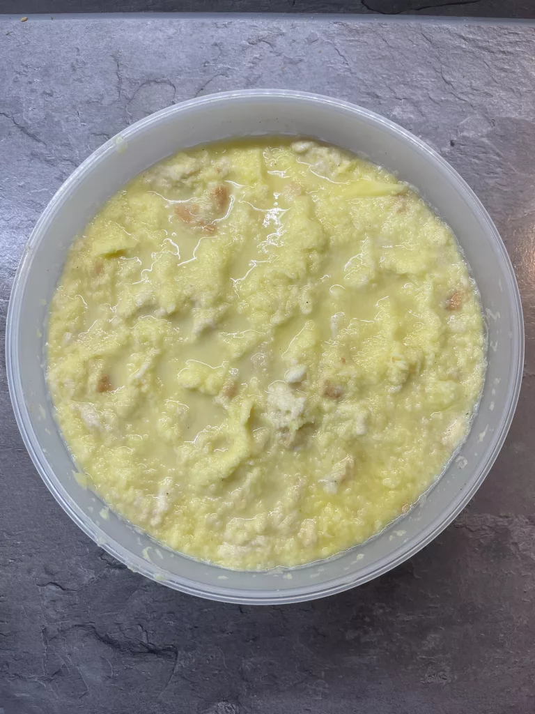 Bevor du die Kartoffel und Zwiebeln reibst, kannst du die beiden Brötchen in der Milch einweichen. Dann wird alles gerieben. Anschließend kommen die aufgeweichten Brötchen samt der restlichen Milch, die Eier, Muskat, Pfeffer und Salz zur geriebenen Masse. Alles wird gut verrührt.