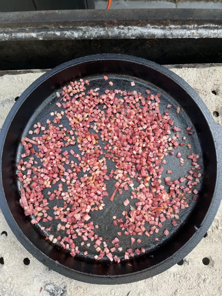 Jetzt ab ans Feuer. Zünde etwa 20 Briketts an. So, dass du später etwa 180 Grad im Dutch Oven hast. Sind die Briketts durchgeglüht, lege sie in den Grill oder Feuerschale und lege den Deckel des Dutch Ovens auf die Glut. Ist der Deckel heiß kann darin der Speck angebraten werden. Nach dem Anbraten kommt der geröstete Speck zur Maße.