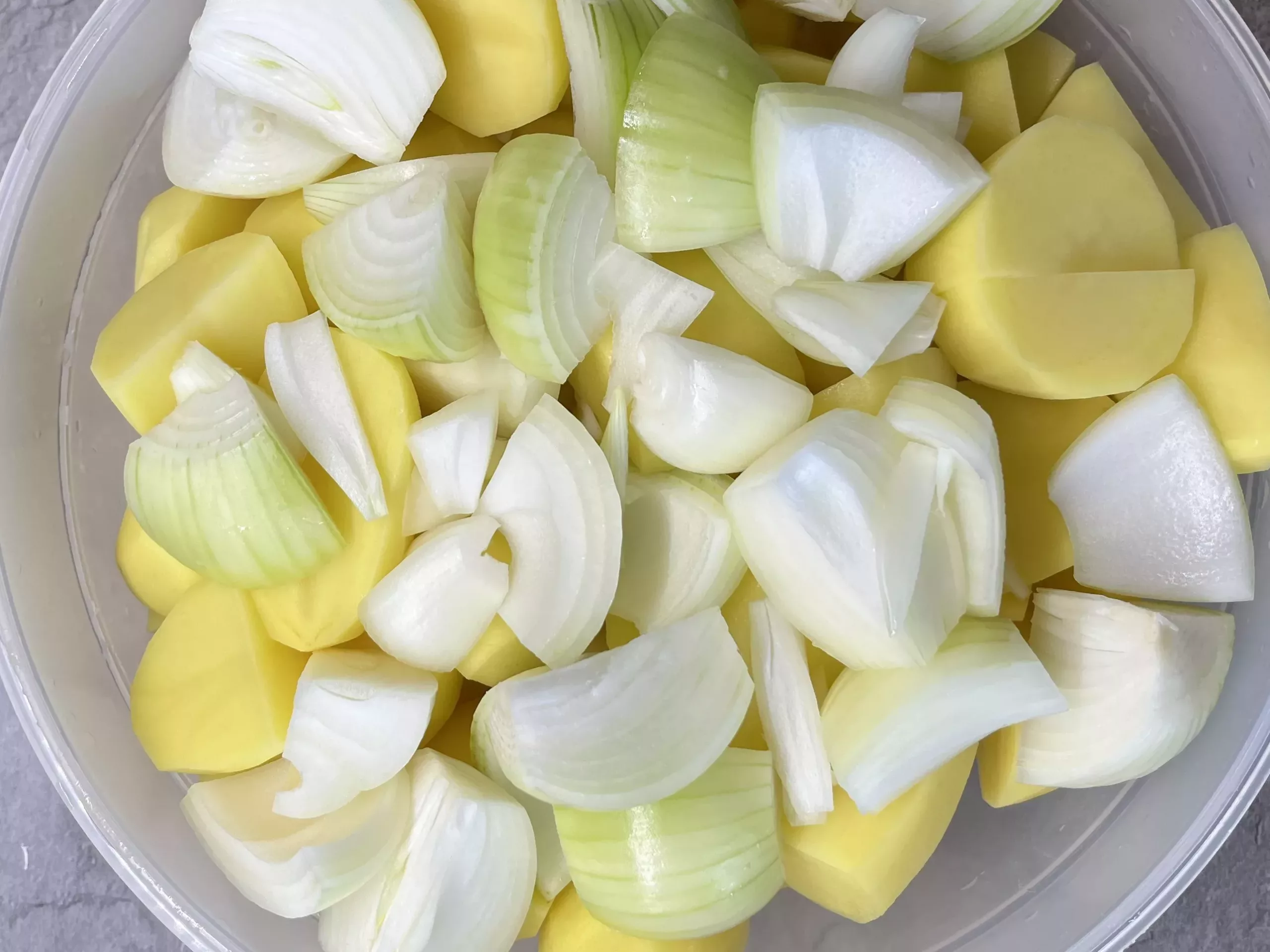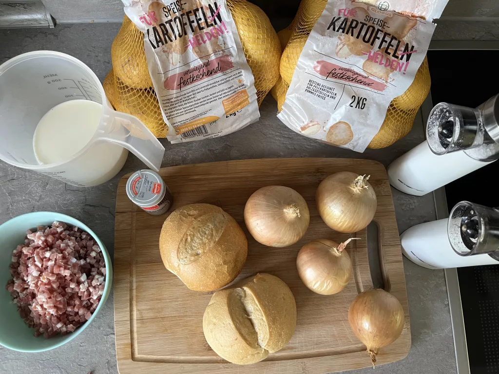 Jetzt gehts erstmal ans „schnippeln“. Schäle und schneide die Kartoffeln und Zwiebeln so klein, dass diese in die Küchenmaschine passen.